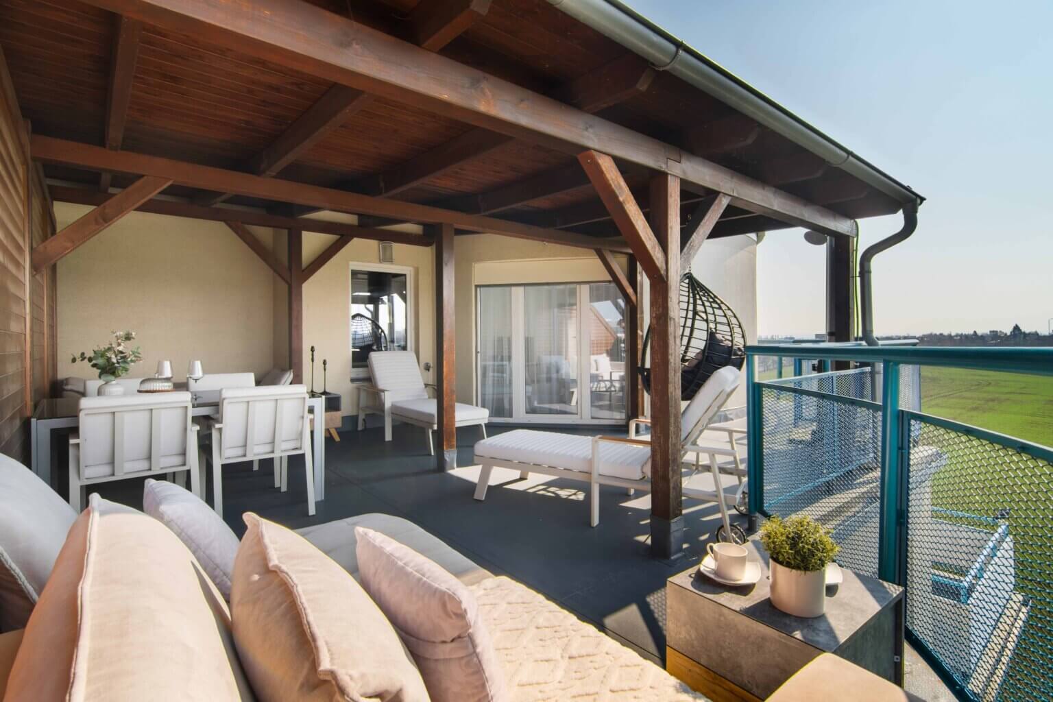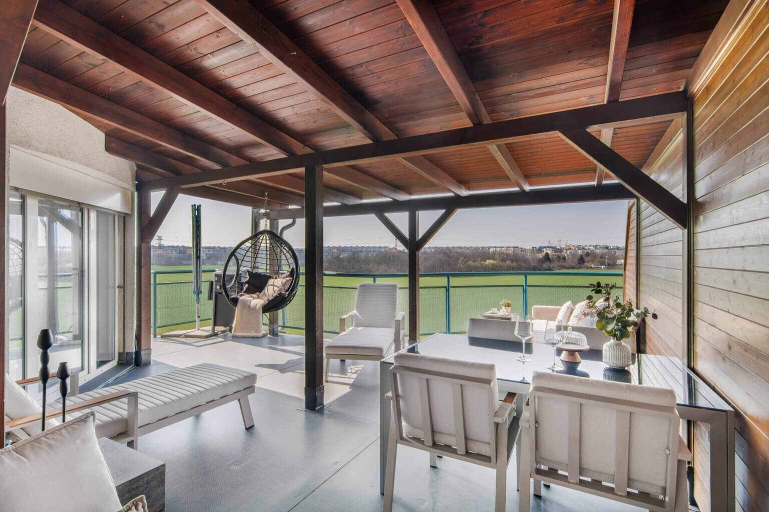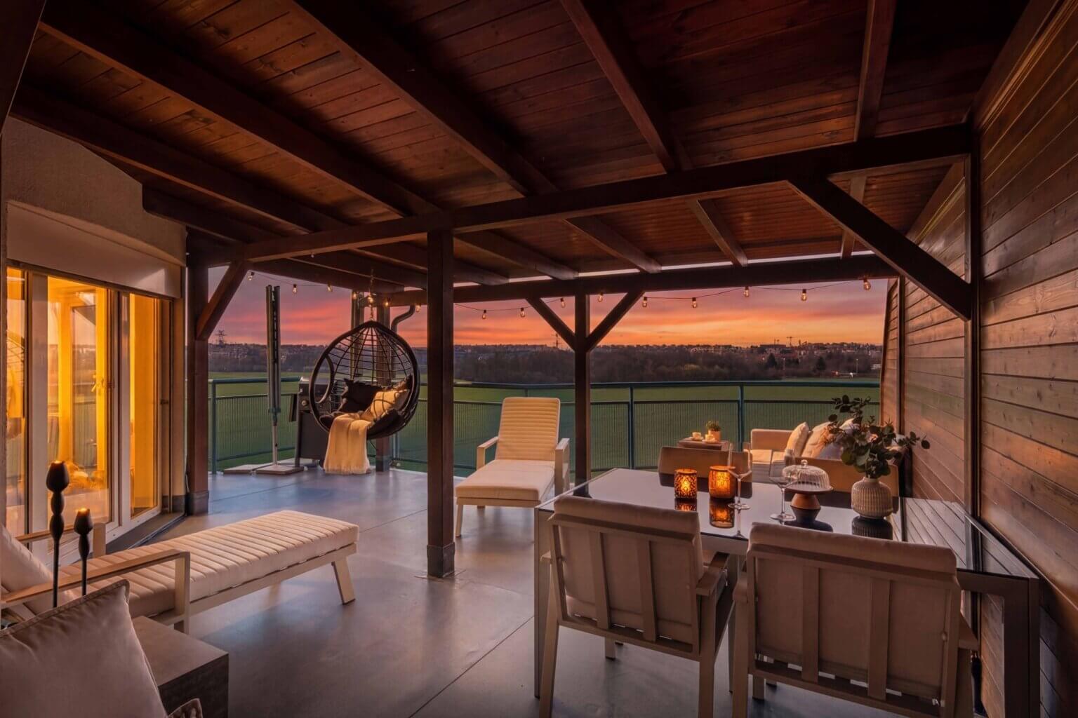 Venkovní prostor o velikosti 49 m² se přirozeně stává součástí bydlení – ráno káva na východě, přes den slunce z jihu a večer západ.