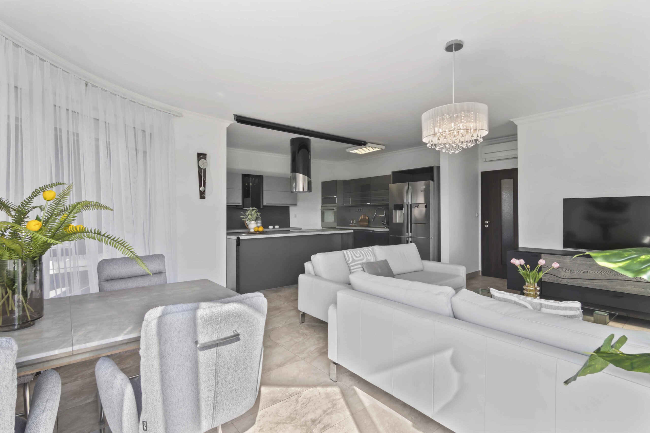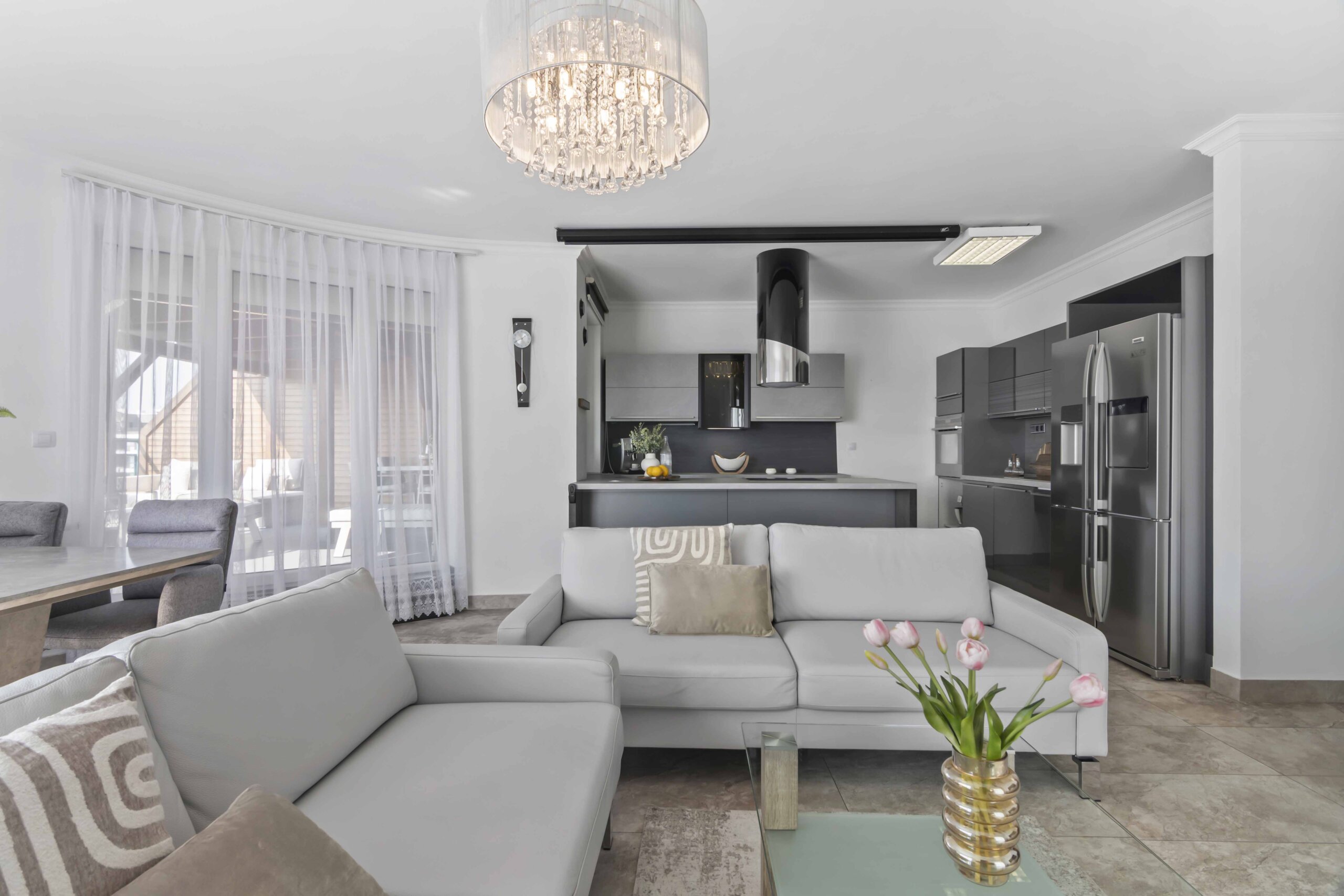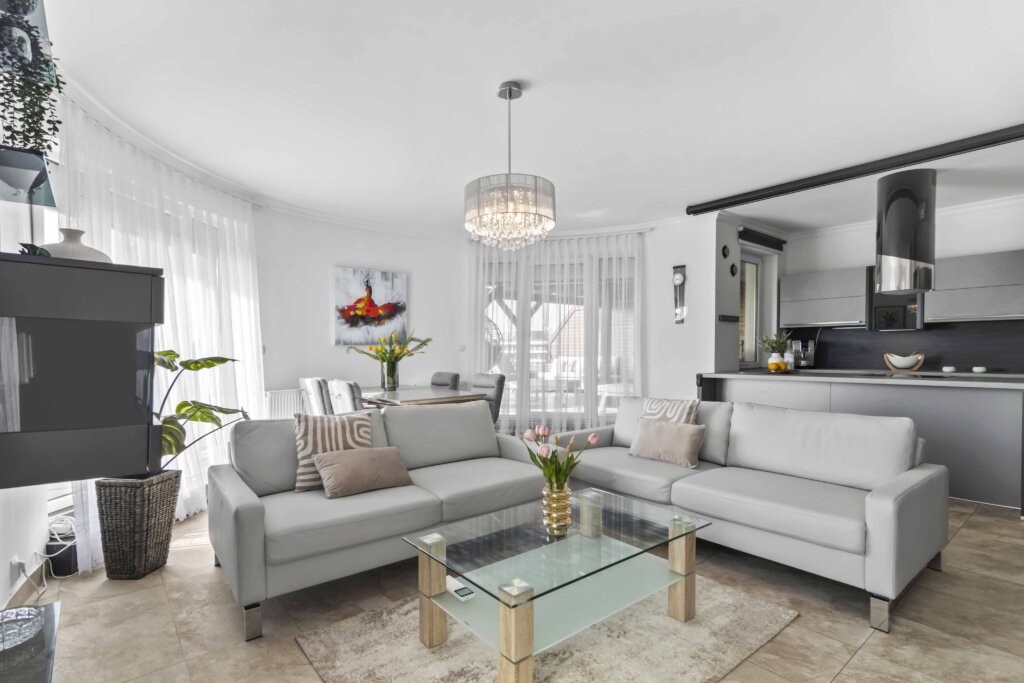 Obývací část působí otevřeně a lehce, přičemž jemně zaoblený roh ji příjemně změkčuje.