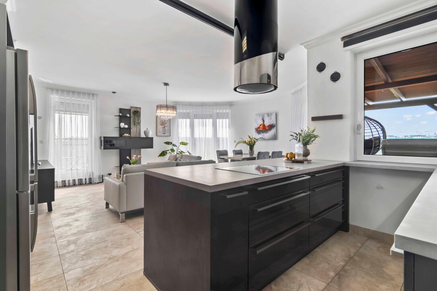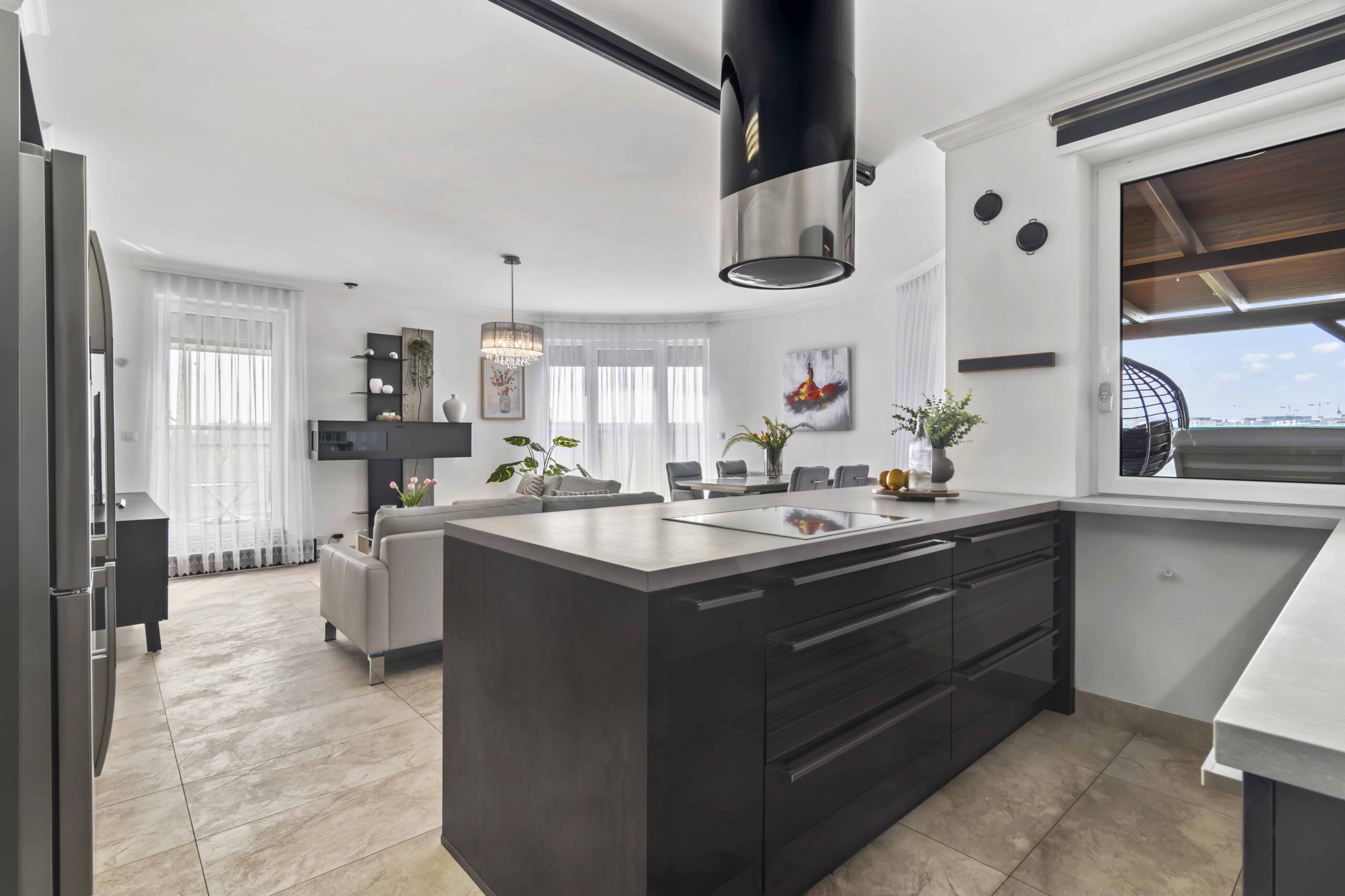 Život se tu přirozeně rozšiřuje ven – na terasu o velikosti čtyřiceti devíti metrů čtverečních, která obepíná celý obývací prostor.